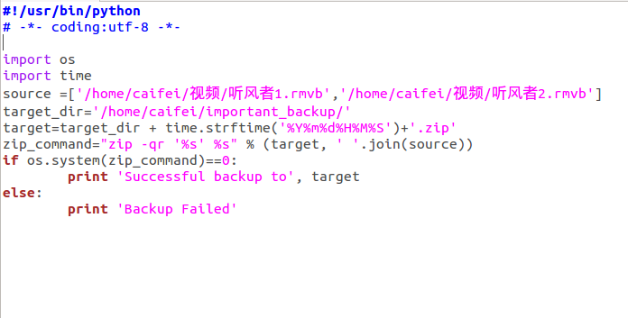 是因为权限得问题,如果我把第七行important_back后面的“/”去掉后,就可以了。但是生成得文件就保存在了"/home/caifei"里面,且以“important_backup”。导致这个结果的可能原因是对于“important_up这个文件夹”,我好像没有权限进行操作,我之接触过单个文件的权限变更,没有遇到过文件夹的,请问高手,我该如何变化文件夹的权限?