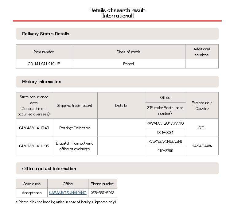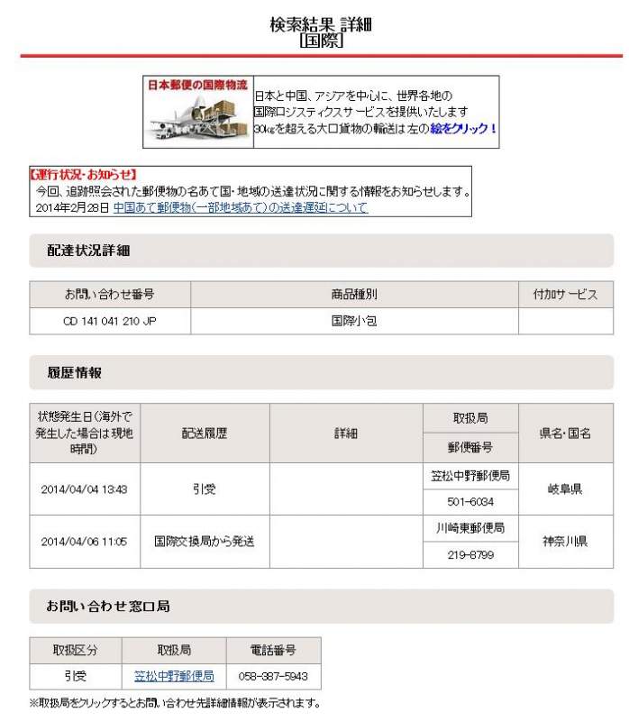 | 最近从日本寄了一包衣服回国(中国),请问谁能帮忙查询一下该包裹到了哪里?单号为:CD141041210JP |