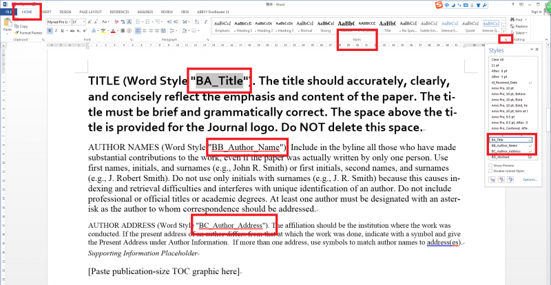 恰好有另一个朋友最近问我关于模板的问题,我下下来再研究了一下,发现OL的模板在去年年底进行过改动(貌似没以前的好用),我之前因为不够了解,回复的不够完整,所以这里再进行一点补充,希望能对你有所帮助(为方便可能有他人参考,这里写的详细一点): 1、首先安装office 2010及安装office 2010语言包,将界面转化为英文的【菜单栏:文件-选项-语言-显示语言(选英文)-设为默认-确定】(我自己尝试了一下,中文状态下模板嵌入的命令好像出不来); 1、进入OL主页,点击submission&review,然后点Information for Authors 【http://pubs.acs.org/page/orlef7/submission/authors.html】,在Preparing for Online Submission的框框里面就有你投稿需要的指南、模板等,点击模板,(即“Document Templates ”),之后点击Template [Word]下载模板。 2、下载的模板后缀为dotx (Template for Electronic Submission to ACS Journals.dotx),即模板格式的文件,所以下载后先另存为(save as)docx的文档,在docx文档里面编辑! 3、下面就是最关键的一点,首先你需要阅读这个模板里面对格式的要求:这里面对文章里面的所有板块(标题,作者,摘要,表格等)都是有具体的格式(在文章里被称为stlyle)要求的,当然这些格式都通过模板里面嵌入的一些命令来实现,例如(见模板文件第二页):TITLE (Word Style "BA_Title" ,AUTHOR NAMES (Word Style "BB_Author_Name" ,ABSTRACT: (Word Style “BD_Abstract”),请注意,"BA_Title", "BB_Author_Name", “BD_Abstract”等stlyles所对应的命令在word菜单栏“HOME”一栏下的“styles”里面,点击style栏下面右下的箭头会弹出所有你需要的命令;(第3条可见附件里面的附图); 4、具体使用的时候,比如大标题,模板说明里面写明了对应项目使用“BA Title”的style,那么你先在模板里输入(或复制粘贴)大标题,用鼠标拉黑,然后点菜单栏“stlyle”命令里面对应的BA title就行了,其他同理!我记得,在插入脚注、参考文献等项目的时候会稍稍麻烦一些,不过你稍微摸索一下,相信是能搞定的! 好吧,就写这些了,希望能对你有所帮助,再次祝你文章顺利接收! 图解.png |