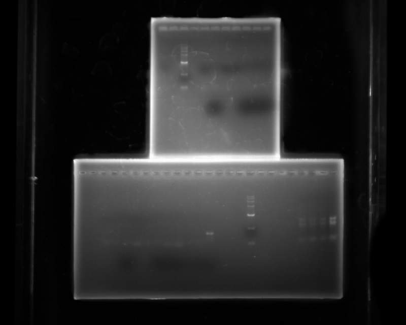 两种引物,两种mix,几种不同的PCR程序,只有一条是目的条带。在大板的那块胶上边,下边的是引物二聚体吗?