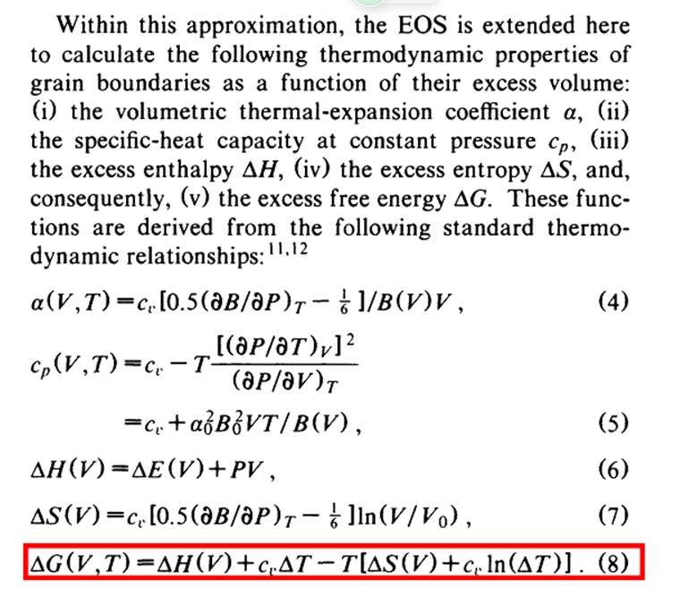 在一篇文章中(Phys. Rev. Lett. 65, 610 )出现了一些公式(见附件图片); 实际上是固体膨胀,体系H,S,G相对于参考态(无膨胀,参考温度为TR)的过剩量。 其中的过剩自由能量,为何不采用G=H-TS的热力学基本关系呢? 查阅了其随后的参考文献,也不能找出原因所在,求教大神。谢谢 相关参考文献有: 1、Thermal expansion of solids at low temperatures 原文链接:http://www.tandfonline.com/doi/a ... 101426#.U2RdRHlIH_A 网上下载链接:http://muchong.com/bbs/viewthread.php?tid=6630997&fpage=1 2、Solid State Physics - Ashcroft, Neil W, Mermin, David http://ishare.iask.sina.com.cn/f/22008970.html 3、L.D.Landau and E.M.Lifshitz, Statistical Physics (Pergamon, New York, 1985),3rd ed. , p. 53 未命名.JPG |