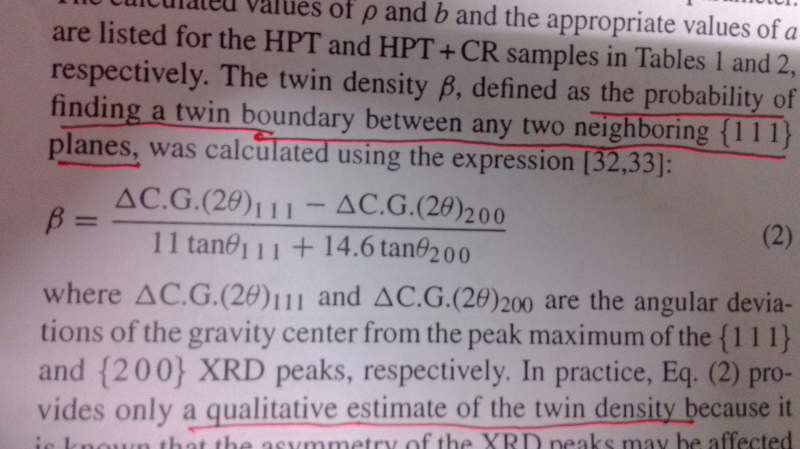 我在用XRD计算孪晶密度的时候遇到angular deviations of the gravity center from the peak maximun,这个是什么意思? 公式详见图片 重谢!!! |