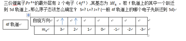 Èý¼ÛïèÀë×Ó¡¼Pr¡½^(3+)µÄ×îÍâ²ãÓÐ2¸öµç×Ó£¨4f^2£©,Æä»ù̬Ϊ3^H_4 ¡£Èôf¹ìµÀÉÏµÄÆäÖÐÒ»¸öԾǨµ½5d¹ìµÀÉÏ£¬ÄÇôÔ×Ó̬¸ÃÔõôȷ¶¨£¿ S=? L=? J=? (Ò»°ã4f¹ìµÀÉϵÄÄĸöµç×ÓÏÈԾǨµ½5d) ¹òÇó´óÉñ°ïæ½âÊÍ![]() ÎÊÌâ.png |
