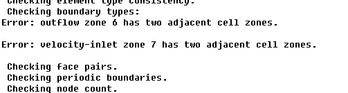 本渣用Gambit 画完网格后,将之导入fluent,出现下面一幕,求大神指导! Error: velocity-inlet zone 5 has two adjacent cell zones. Error: pressure-outlet zone 7 has two adjacent cell zones. |