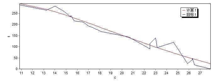 拟合方程为t=(1/(k1*2103))*(30-c+k2*ln(30/c)+(30^2-c^2)/(2*k3)) 实验数据下面的或者见附件 t c 0 27.93 18 26.50 24 25.88 42 26.31 48 26.31 90 22.51 96 23.15 114 22.51 120 24.62 139 23.01 144 20.59 168 18.16 186 17.36 192 17.03 210 16.55 216 15.74 234 15.39 240 15.43 258 14.84 264 13.24 282 14.03 288 10.84 |