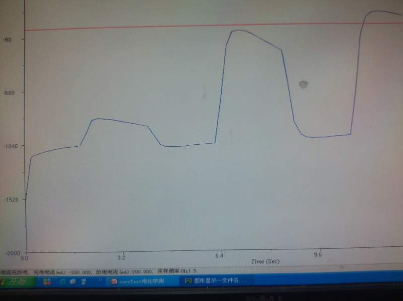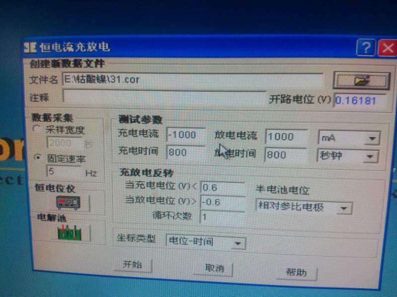 本人超级电容器新手,做了一个恒流充放电测试,电极材料是钴酸镍,涂在泡沫镍上,参比电极为饱和甘汞电极,辅助电极为铂电极,在科思特CS360上做的测试,参数设置如下