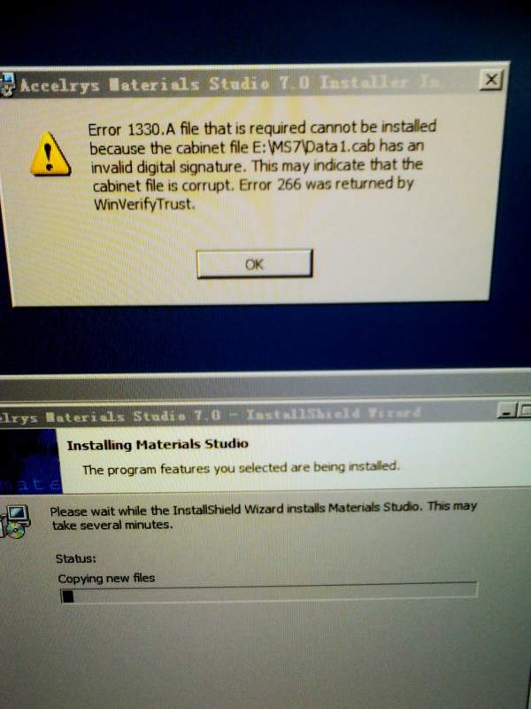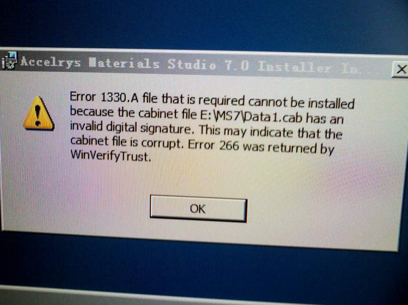 新装32Windows8系统,安装materials studio7.0时出现如图中错误提示。以前的64位Windows7系统可以正常使用。