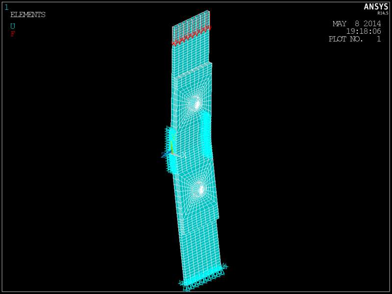 我的模型如下,在顶部施加力载荷,侧面角度处有x方向的约束,底部固支,求解后我想得出顶部的位移与底部的支反力的位移-载荷图,自己在/post26中试了几次输出的都是直线,请问位移-载荷图能在一个载荷步中输出吗?还是需要几个载荷步才能输出斜线的那种? 我是ansys新手,特别是时间后处理,基本上不懂,希望高手能够指教下,最好有命令流