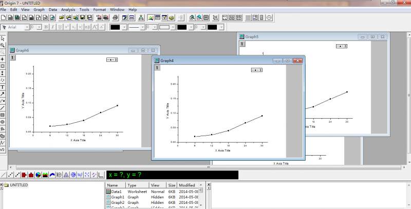 我用的是Origin7,怎么把4个图放到一个坐标轴里(4种物质在5个不同的时间里测的吸光度值);或者在一个坐标轴能同时做出4个图。谢谢帮忙!