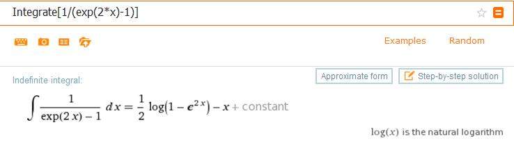 http://www.wolframalpha.com/input/?i=Integrate%5B1%2F%28exp%282*x%29-1%29%5D&dataset=