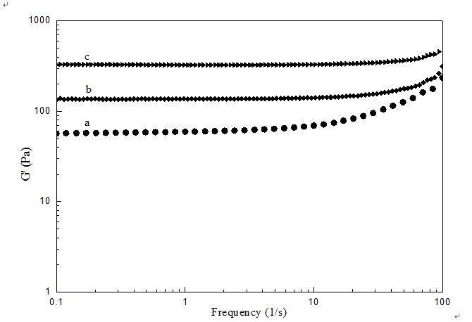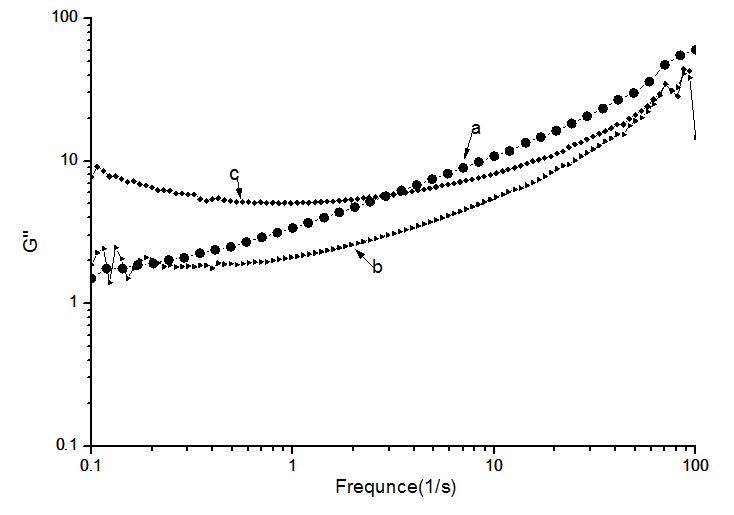 合成了不同交联度的化学交联水凝胶,做了一下流变。在分析中,频率扫描,能反应水凝胶的什么性能,能反应分子的柔顺性?下图G''有不正常,求解释。交联度c>b>a。