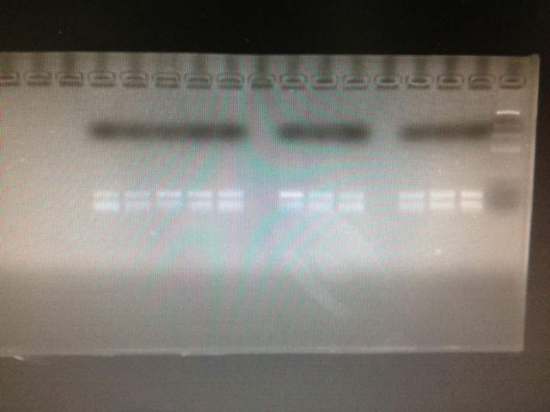 想做荧光定量PCR,这个是我反转录后用常规PCR扩增内参基因跑出来的图,上面一条是目的条带,请教各位大侠这是什么原因出现这种情况,怎么改善?谢谢! BML]~CD9M[_56SGTI1QNA`U.jpg |