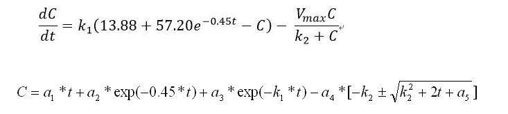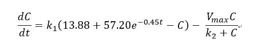 求这个C关于t的方程的解,式子中K1,K2 , Vmax 都是已知数。谢谢各位了,如果答案够详细小弟在追加50个金币(不知道小木虫有没有这个操作。。。)