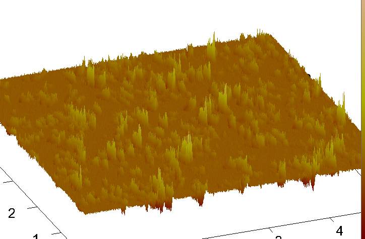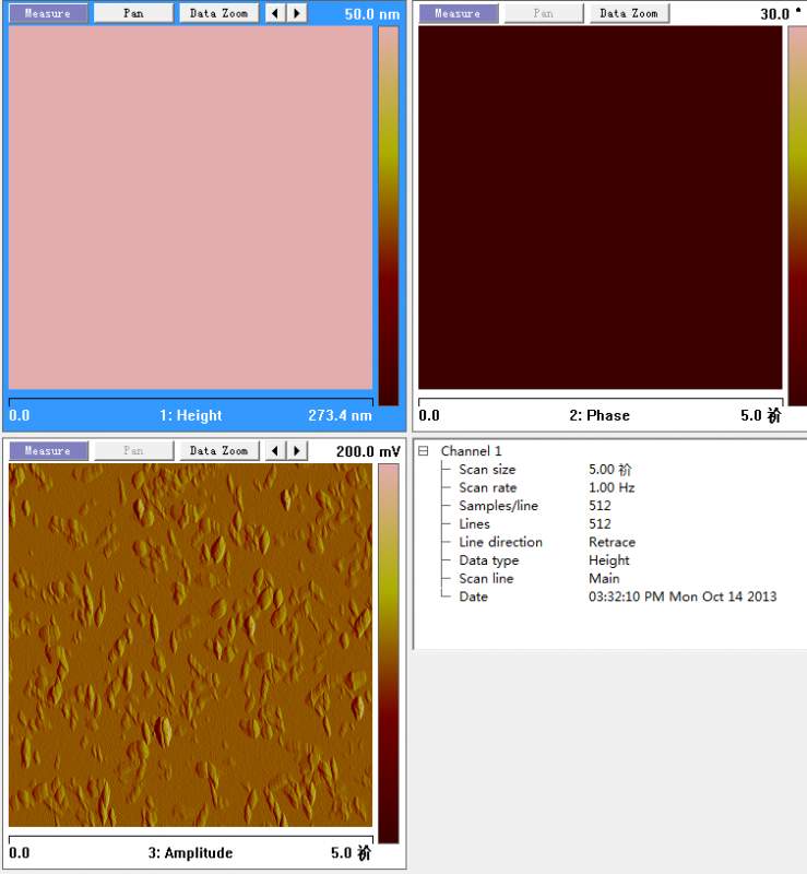 1. 如果是成膜的样品,那应该表面非常平整。 那张粉色的平面图之所以看上去很平,可能是因为你选的是整个扫描范围的很小部分。你看下正方形图像的边长尺度是273.4 nm。 而图2的立体图看上去也很平,可能是因为Z向标尺太大了。把标尺范围缩小一些试试。 从图3的振幅立体图看,应该是扫描参数有些问题,将IGain降低些扫图试试。样品成膜后晾干了吗? 2. 膜厚只能用高度图。不过测量膜厚需要在膜上用尖锐一些的东西轻轻划一下,露出基底。然后扫描时图像中包含这个划过的线,就可测量膜的高度。再测量下空白基底,这样测量了膜厚自然可以说明成膜性。 |