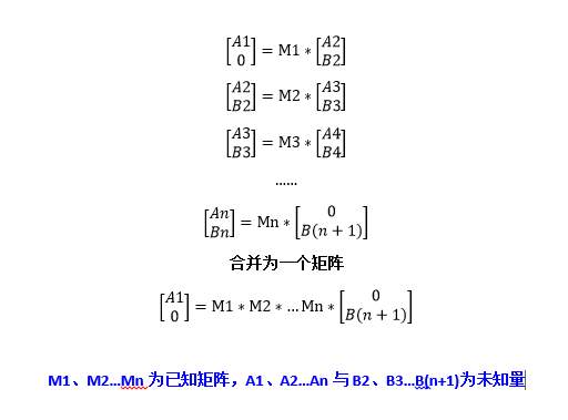 如图所示,定义了这样一个传输矩阵,其中M1、M2…Mn为已知矩阵,A1、A2…An与B2、B3…B(n+1)为未知量,即待求变量。