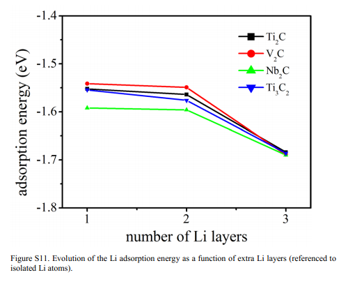 文献中讲到,吸附两个Li的时候,吸附能略小于Li单质,而吸附3个Li 时吸附能与Li单质相当。但文献中提供的图说明,吸附2个和吸附3个锂原子的吸附能差别很大,而且吸附3个锂原子的吸附能比吸附1个和2个的能量低得多,这不是说明吸附越多的锂原子结构更稳定吗?这不是与实际理论相悖了吗