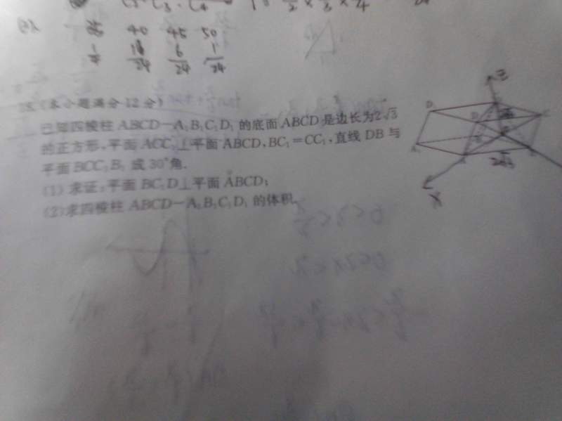 已知四棱柱ABCD—A1B1C1D1的底面ABCD是边长2倍根号3的正方形,平面ACC1垂直平面ABCD,BC1=CC1,直线与平面BCC1B1成30度角 (1)求证平面BC1D垂直平面ABCD (2)求四棱柱ABCD—A1B1C1D1的体积 题目.jpg |