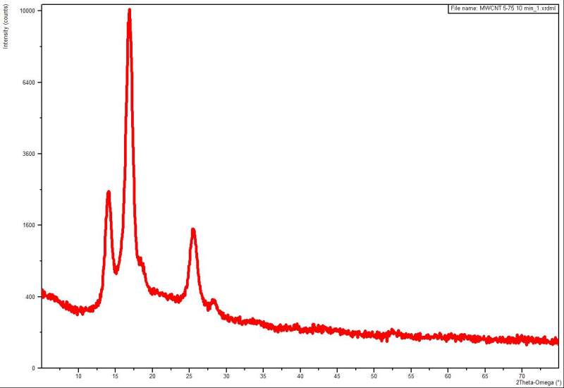 CNT的XRD图中,14度和17度的峰是什么?这些峰还在Graphene膜中出现过。。 请教CNT的XRD图中,14度和17度的峰是什么? 这些峰还在Graphene膜中出现过,如图2. 应该是GO的峰吧? 别的样品就没有,排除了仪器错误或设置错误。 请大神们指点! MWCNT 5-75 10 min_1.JPG |
