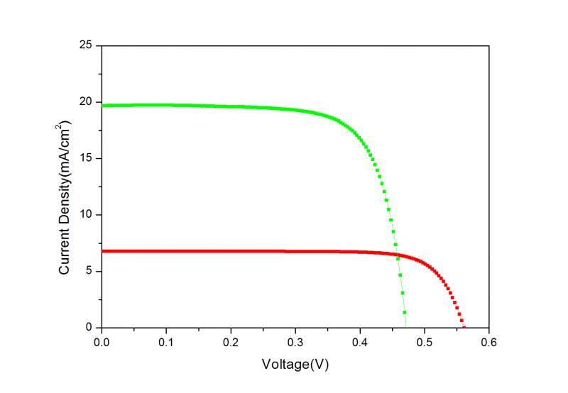 后来我又做了一个,IV特性曲线和前次对比图如下,这次填充因子为0.73,效率为6.7%。为什么这次填充因子高,效率反而低呢!不是一般都是填充因子高效率相应地就高吗?