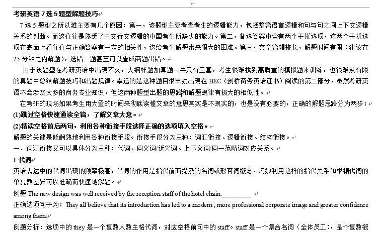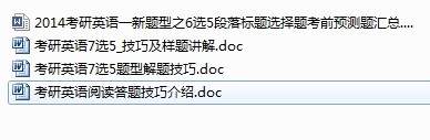 首先声明,这些是我通过网络搜索和整理的,对我个人的帮助很大 所以和大家分享下,希望对大家有帮助 因为7选5只要掌握了做题方法,准确率会很高 还有阅读也是考研中很重要的一部分 在提高自己词汇量基础上 再加上一些做题方法 分数会提高的快一些 资料中有几十页 所以要有耐心看完哦 1.jpg 2.jpg |