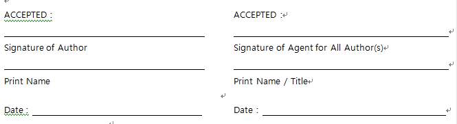 有这两栏,ACCEPTED:填YES? 右边栏中Signature of Agent for All Author(s)这个是啥意思啊? Print Name 是要手写工整的签名? 所有作者的名字都要签吧? B{@VJ]L5I0AOSZ)N2H448`H.jpg |