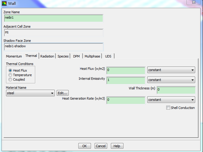 我做的是一个末级过热器的模拟,现在在算烟气纵向冲刷一根u型管,为了简化计算,不考虑蒸汽侧热偏差,即受热管内壁采用对流换热边界条件,对流换热系数为6488W/㎡,但是我的金属内壁在设置项里面只有热流密度,温度和耦合(coupled),如图所示,所以之前采用的是耦合条件,但是发现计算结果有问题,现在还是想把内壁的边界条件设为恒定对流换热系数,不知道怎么操作,希望各位能够赐教,先谢谢啦! 捕获.PNG |