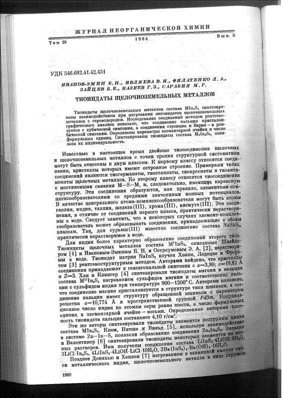 有人提到,在这篇文献中,作者利用H2S硫化相应氧化物(猜测可能是CaIn2O4)得到了立方相的CaIn2S4。但因为这篇文献是俄文的,实在看不懂,所以想请懂俄文的虫子帮忙翻译一下他的实验过程,作者是怎么合成CaIn2S4的。