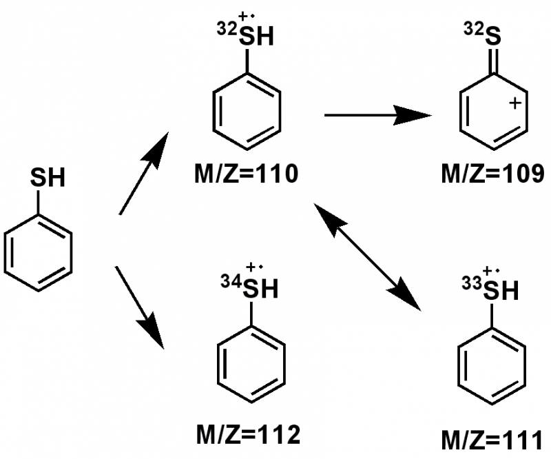 答案为 苯硫酚 ,分子离子为110所以不含N根据M/Z=110与M/Z=112的比值推测分子中含有一个S,M/Z=112为同位素S34所产生的同位素峰,根据M/Z=110与M/Z=111的比值推测分子中含有6个C原子(111中含有S33贡献的0.80),其余的为H一共有6个,计算不饱和度为4,因为基峰为M/Z=110(100%)所以推测其含有苯环,又其失去一个H的M/Z=109丰度较高,所以推测结构为苯硫酚