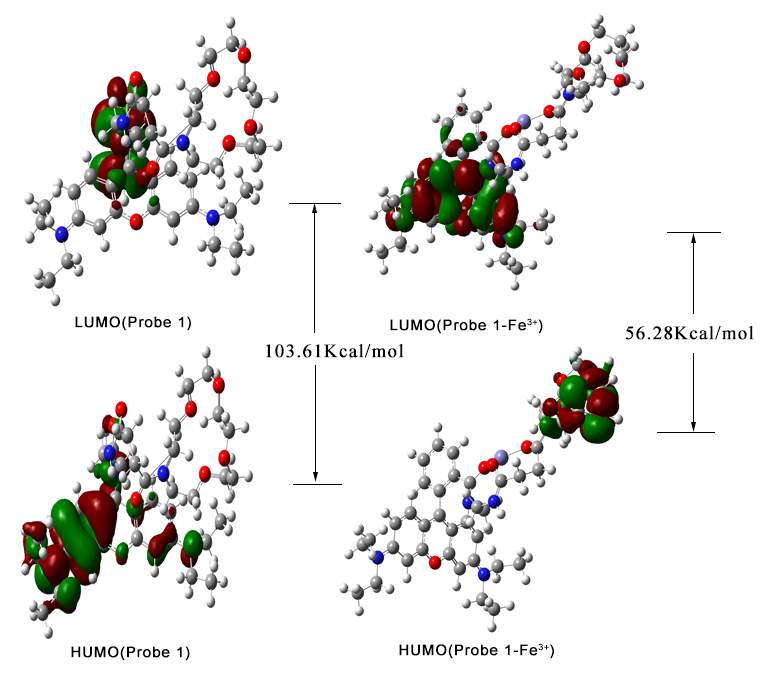 从这个HOMO-LUMO图完全无法看出Fe是否容易络合上去。想看这个,可以用Multiwfn做配位键的键级分析。