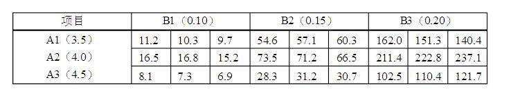 为提高粒粒橙果汁饮料的稳定性,研究了果汁pH值(A)、魔芋精粉浓度(B)两个因素不同水平组合对果汁黏度的影响。果汁pH值取3.5,4.0,4.5三个水平,魔芋精粉浓度取0.10,0.15,0.20三个水平,每个水平重复3次,进行了完全随机化试验。试验指标为果汁黏度(CP)越高越好。试验结果如下表,试作方差分析(本题应作对数转换y=lgx后再做分析)。