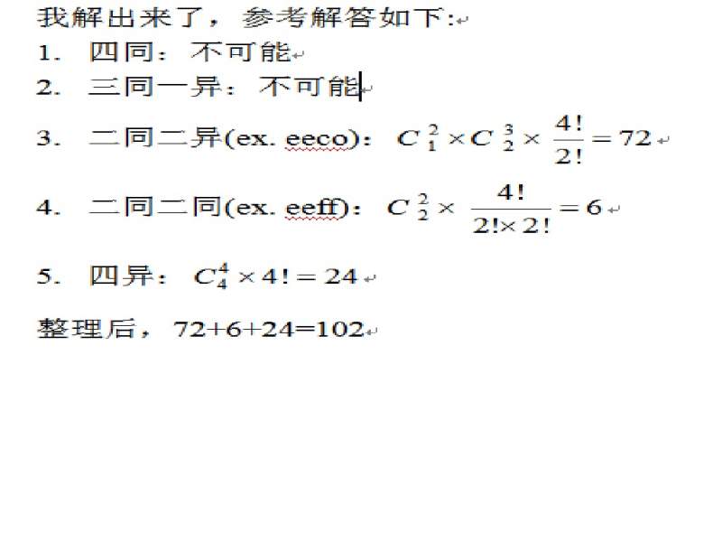 请问『从coffee六个字母中任取四个字母排成一列﹐则排法有?』, 麻烦解答请解释得详细些,谢谢。 |
