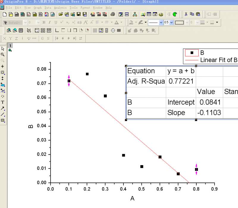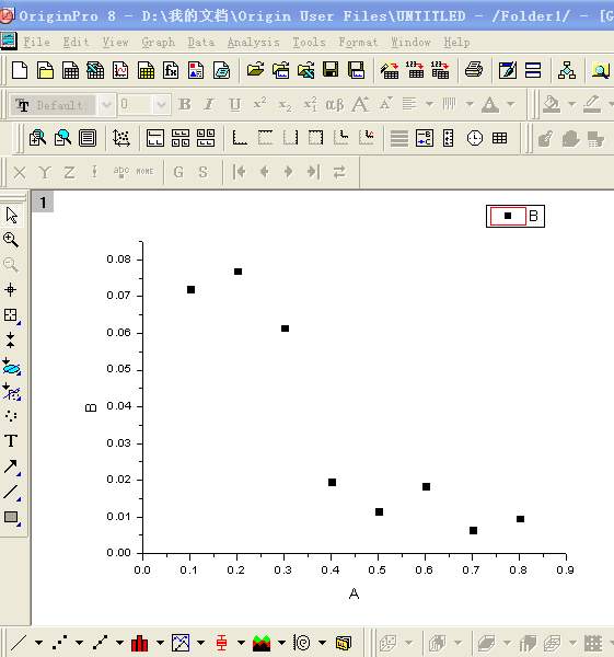 0.1 0.07203 0.2 0.07697 0.3 0.06146 0.4 0.01958 0.5 0.01159 0.6 0.01835 0.7 0.00649 0.8 0.00961 这一组数怎么用origin拟合出来一个曲线啊 |