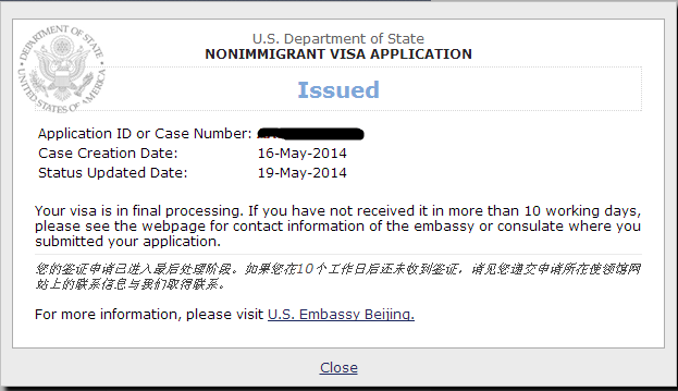 准备就绪之后开始申请签证(这些事情建议各位早规划早实施,肯定还是有好处的),照相、DS160、支持性材料的准备都不在话下。论坛里各种教程也都很齐全。然后就是去中信交费、预约面谈时间。楼主的预约是5月16日星期五下午14点45分在北京安家楼的美帝大使馆进行面谈。