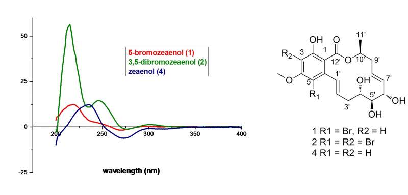 如下图所示,我文章上放CD谱图的目的是想说明化合物1,2与已知化合物4在275nm左右负cotton效应说明10’位是S构型。审稿意见让解释为什么化合物1,2与已知化合物4的CD差别这么大,请问哪位能帮我解释一下,不胜感激!
