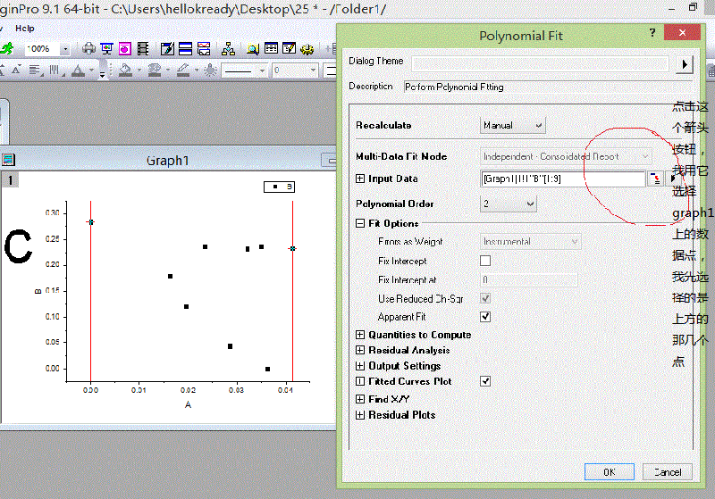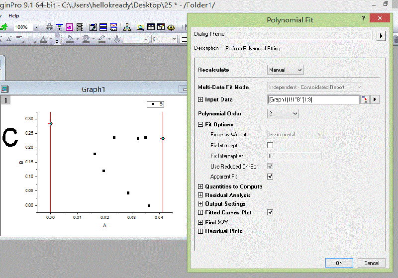 您好,可以说的详细点吗?我找到了Analysis下的Fitting然后选择polynomial fitting,我在它打开的对话框中选择数据(像excel一样)但是不对,我还没想明白。