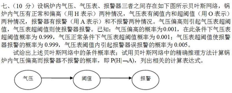 设锅炉内气压、气压表、报警器三者之间存在如下图所示贝叶斯网络,锅炉内气压有正常和偏高(用H表示)两种情况,气压表有阈值内和超阈值(用O表示)两种情况,报警器有报警(用A表示)和不报警两种情况。气压偏高则引起气压表超阈值,气压表超阈值则使报警器报警。已知:气压偏高的概率为0.001,在此条件下气压表超阈值概率为0.999,气压正常条件下气压表超阈值概率为0.001;气压表超阈值使报警器报警的概率为0.999,气压表阈值内引起报警器误报警的概率为0.005。 试给出上述贝叶斯网络中的条件概率表;试用贝叶斯网络中的精确推理方法计算锅炉内气压偏高而报警器不报警的概率,即P(H|﹁A),列出相关的计算表达式。