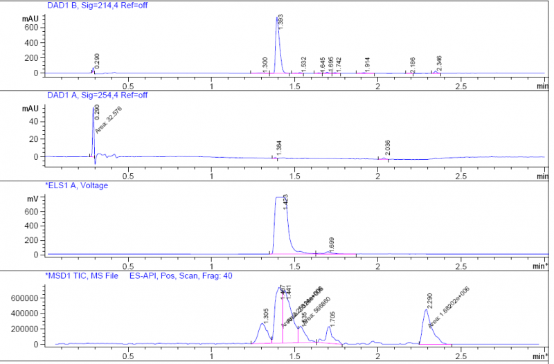 老师您好,首先非常感谢您的回复~能再请教下吗:首先,能否帮我判断下1.41min的东西大概结构吗?还有就是不论分子如何裂解,LCMS上显示的都会有该分子的分子离子峰的分子量显示,不论显示强弱?会不会比如一个物质LCMS只会显示其裂解的片段峰而其分子离子峰完全不显示的现象?
