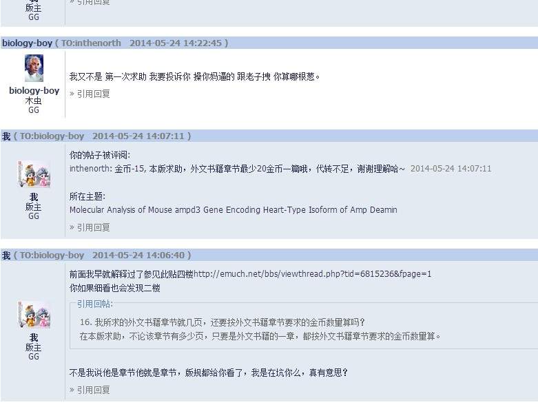 ID biology-boy 对文献版版主的正常管理不服,在版主对相关管理进行耐心解释之后依旧不服版主的管理,辱骂版主,按照版规, https://muchong.com/bbs/viewthread.php?tid=6306288 文献版禁言一个月。 https://muchong.com/bbs/viewthread.php?tid=7451474 |