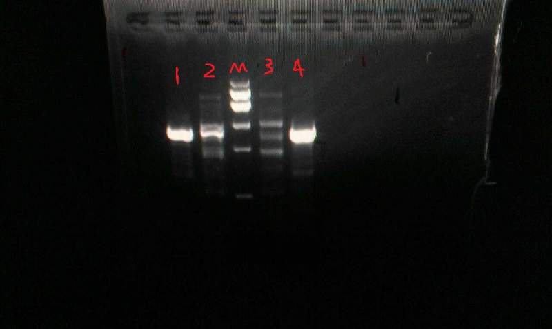 如下图,1与4是同一产物(模板,引物,PCR温度时间等条件完全一样),2与3是同一产物(模板,引物,PCR温度时间等条件完全一样),M是Marker,6个条带,分别是500bp 1000bp 1500bp ……(后面三条忘记了 )。想请教各位大神们,2与3 究竟有没有p出来啊?我纯化2与3后,浓度都是70+ng/ul,对吗?出了什么问题啊?!注:2与3片段约1200bp。 955.jpg |