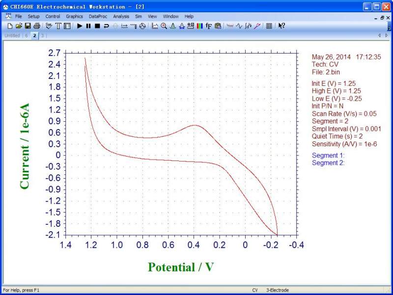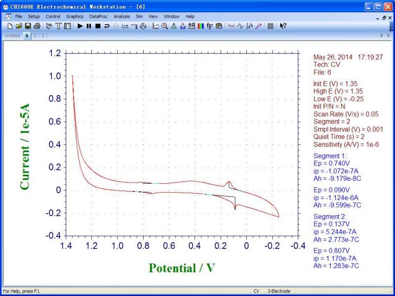 同样条件下,一张是扫描了第二次,一张是扫描了第六次,为什么多了两个尖峰?是什么反应?最佳波形是峰电流1:1,峰位差90mv,这种波形峰电流和峰位差怎么看?用的是三电极系统,工作电极为玻碳电极。