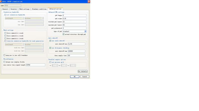 请问各位大牛关于乱序非周期的FDTD乱序仿真时,边界条件要设置成PML,但是在运行时不收敛,是不是要在advanced PML settings 中改变一些参量?跪求几个参量的物理意义。 1.JPG 2.JPG |