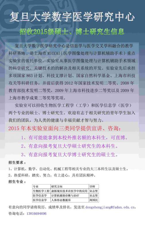 复旦大学数字医学中心招收2015级硕士生、博士生,详见海报