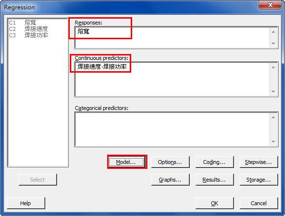 大概就是自变量是‘焊接速度’和‘焊接功率’,响应是‘熔宽’,想进行回归分析,大概拟合出 熔宽=A+B*焊接速度+C*焊接功率 +D*焊接速度*焊接功率 这样一个表达式,求各位大神帮助