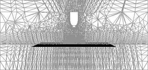 这是一个模拟喷枪喷射的二维网格,他把包括喷枪的正方形分成了几个横向小长方形,每个横向小长方形都用三角形网格来划分,但是他这里除了中间区域用了很多横线来划分,他还保证了每两条横线之间只留一个三角形网格,请问这要怎么画才能达到这样的效果啊?