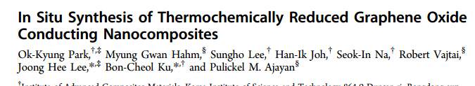 《In Situ Synthesis of Thermochemically Reduced Graphene Oxid Conducting Nanocomposites》作者为Ok-Kyung Park,Myung Gwan Hahm,Sungho Lee,Han-Ik Joh,Seok-In Na,Robert Vajtai,Joong Hee Lee,*Bon-Cheol Ku,*and Pulickel M. Ajayan