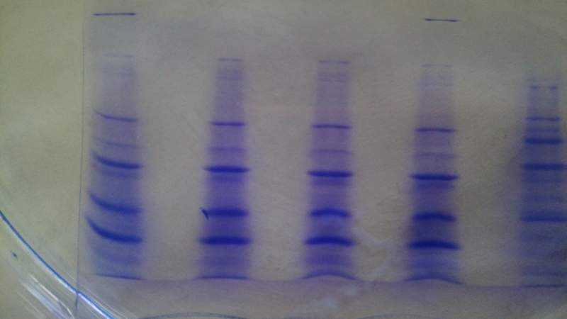 ,跑SDS-PAGE,Marker中总有杂带,详情见附件,这些杂带弄得我都不知道真正的Marker条带了,找了各种原因,加热,加DTT,分离胶浓度,各种有问题的地方都试过了,我的发酵液样品跑的很好,可使Marker却让我如此难堪!