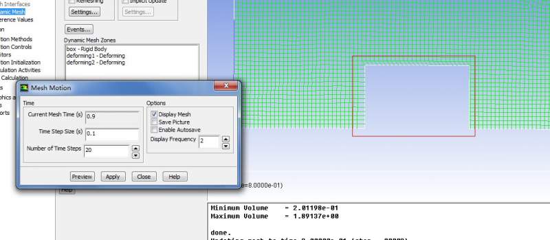 如图所示,现在希望那个小方块的三边沿着底边移动,用的layering默认设置,box用的rigid body,box左右两底边设置的deforming。网格大小1m,UDF写的移动速度是1M/S。 步长0.005s,预览网格在到1s时总是出现负体积,请教是什么原因。。谢谢··· 1.png 2.jpg |
