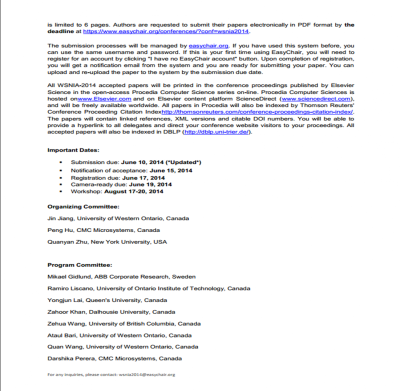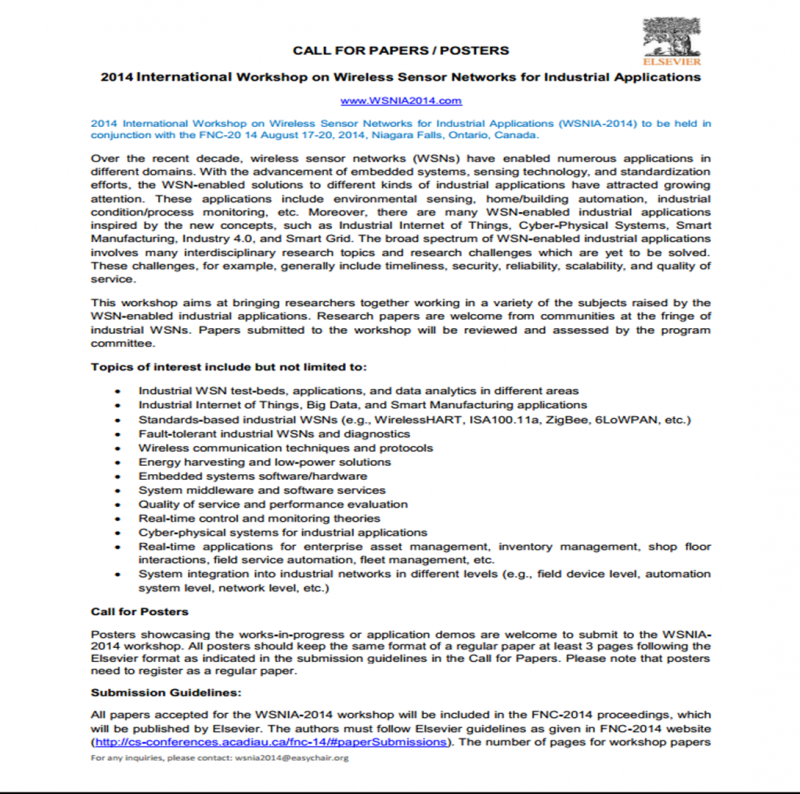 工业应用传感器网络国际研讨会(WSNIA‘14)征稿 ---------研讨会中文简介------------- (时间地点:8月17-20日,加拿大 尼亚加拉大瀑布 | 网站:www.WSNIA2014.com ) (**如研讨会网站国内无法打开,请参见下面图片格式的英文征稿启事**) 近来,传感器网络已经在不同领域得到广泛的应用。同时,随着嵌入式系统、传感技术和标准化工作的推进,基于传感器网络的解决方案和各种不同的工业应用已经引起越来越多的关注。这些应用包括环境检测,家庭/楼宇自动化,工业状态/过程监控等,此外还有很多以工业传感器网络为基础的新型工业应用,如工业物联网、信息物理融合系统、智能制造,工业4.0和智能电网等。但是,无线传感器网络功能的工业应用中广泛涉及到许多跨学科的研究课题和亟待解决的诸多挑战,包括实时性、安全性、可靠性、可扩展性以及服务质量等。 本次研讨会目的在于使世界各国的学者一同交流和探讨各种工业(无线)传感器网络的应用。研讨会将接收工业应用传感器网络的英文科研论文以及项目进展短论文(不少于3页)。论文将提交到程序委员会审稿。研讨会录用的论文将被Elsevier Procedia Computer Science series 国际期刊收录。 本次研讨会涵盖的主题包括但不限于: - 工业传感器网络测试床、应用程序,以及在不同领域的数据分析 - 工业物联网,大数据和智能制造应用 - 基于开放标准的工业无线传感器网络(如WirelessHART ,ISA100.11a ,ZigBee , 6LoWPAN等) - 容错的工业无线传感器网络和诊断 - 无线通信技术和协议 - 能源采集和低功耗解决方案 - 嵌入式系统软件/硬件 - 系统中间件和软件服务 - 服务质量与性能评估方法 - 实时控制和监测的理论 - 网络物理系统的工业应用 - 企业资产管理,库存管理,车间互动,现场服务自动化等实时应用 - 工业网络的不同层次的系统集成(例如,现场设备级,自动化系统级,网络级等) 作者须知: 论文请限于6页,排版格式请参照Elsevier期刊格式,模板可从http://www.journals.elsevier.com/procedia-computer-science/ 下载。论文投稿网站为:https://www.easychair.org/conferences/?conf=wsnia2014。 重要日期: 投稿截止:2014年6月10日 录用通知:2014年6月15日前 会议时间:2014年8月17-20日 联系我们: 如有任何问题,请发邮件至:wsnia2014@easychair.org ---------英文征稿启事---------------- [ Last edited by WSNIA on 2014-6-4 at 01:05 ] |