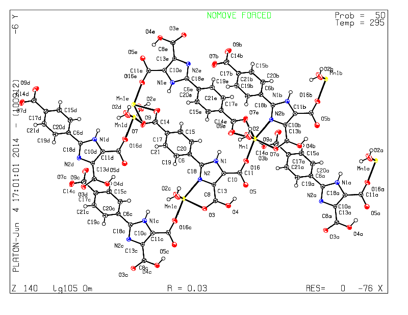 新手解的。 数据收集完整性较低,都Omit 0 50了。G105_0m.cif没有A,B类错误。LG105_0m.cif剩余一个B类错误,无法解决。 Alert level B Crystal system given = monoclinic PLAT232_ALERT_2_B Hirshfeld Test Diff (M-X) Mn1 -- O5_e .. 10.4 su 不知道你的a.cif和b.cif是什么意思。也不清楚你的溶剂是什么,配体是什么。解出来的结果与a.cif和b.cif差别很大。 |