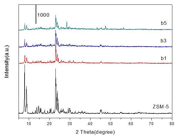 如图b5样品中比空白样ZSM-5多出几个峰,主要在27.185, 43.328 和47.425。